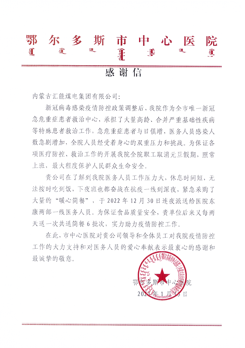 鄂爾多斯市中心醫(yī)院 感謝信