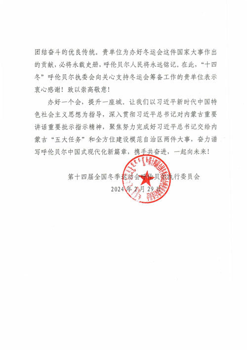 相約呼倫貝爾,點燃冰雪激情,綻放中國夢想。2024年2 月27日,舉世矚目的第十四屆全國冬季運動會在內蒙古呼倫貝 爾勝利閉幕。賽事舉辦前后,貴單位立足高定位、聚焦高質量、 堅持高標準,同呼倫貝爾執委會凝聚起萬眾一心、奉獻冬運的 強大合力,圓滿完成“十四冬”工作任務,得到了社會各界的 高度評價和廣泛贊譽,為全國人民呈現了一屆精彩紛呈、簡約 安全、綠色惠民的冰雪盛會。