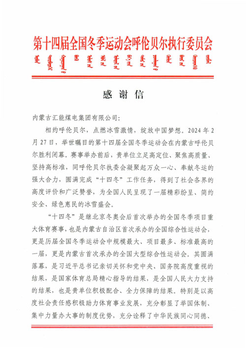 “十四冬”是繼北京冬奧會后首次舉辦的全國冬季項目重 大體育賽事,也是內蒙古自治區首次承辦的全國綜合性運動會, 更是歷屆全國冬季運動會中規模最大、項目最多、標準最高的 一屆,更是內蒙古首次承辦的全國大型綜合性運動會。其圓滿 落幕,是習近平總書記親切關懷和黨中央、國務院高度重視的 結果,是國家體育總局精心指導的結果,是全國人民大力支持 的結果,也是貴單位積極配合、全力保障的結果。特別是以高 度社會責任感積極助力體育事業發展,充分彰顯了舉國體制、 集中力量辦大事的制度優勢,充分詮釋了中華民族同心同德、團結奮斗的優良傳統。貴單位為辦好冬運會這件國家大事作出